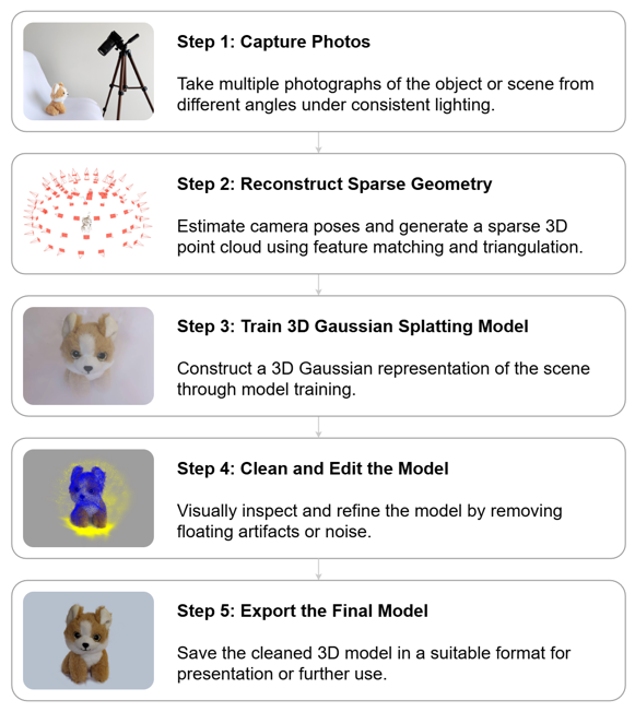 Этот туториал объясняет, как реконструировать 3D‑сцену по реальным фотографиям с использованием Gaussian Splatting. Метод был представлен в работе 3D Gaussian Splatting for Real-Time Radiance Field Rendering (Kerbl et al., 2023).