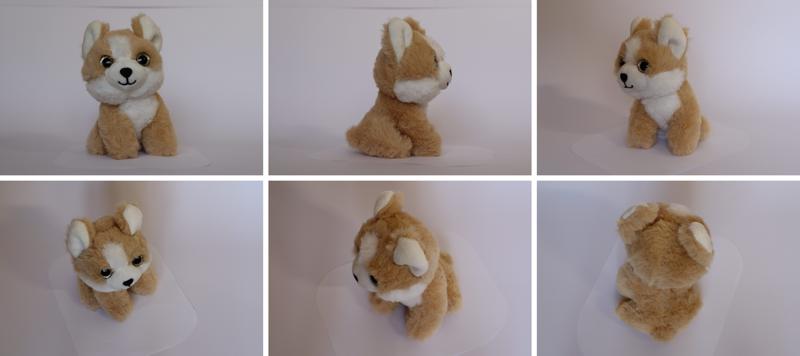В этом туториале используется 84 входных изображения с разрешением 3000 × 2000, снятых камерой Canon M200 на штативе. Плюшевая игрушка была размещена на стуле, накрытом двумя скреплёнными листами белой бумаги 50 × 70 см, образующими изогнутый фон. Дополнительный лист снизу позволял удобно поворачивать объект во время съёмки, при этом камера оставалась неподвижной для каждого «бубликообразного» обхода.